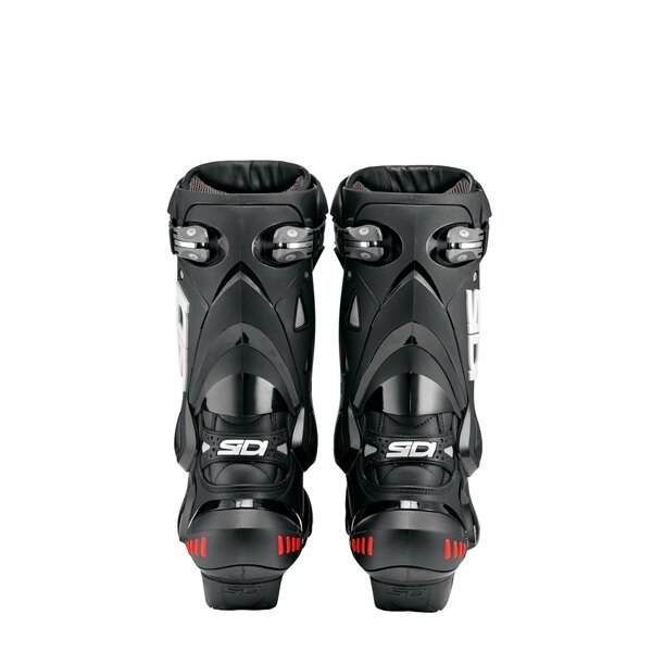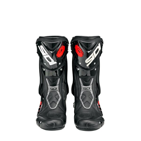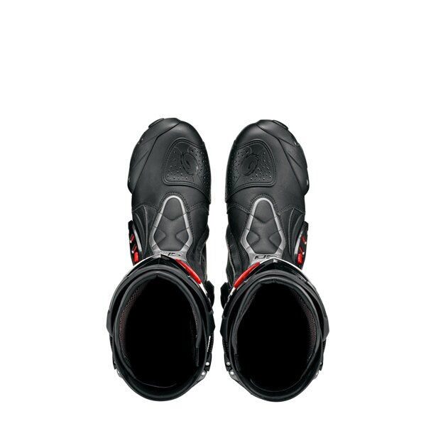 ZIP ELASTIC PANEL Sidi has added a small elastic panel to aid in a smooth zipper operation as it allows a bit of movement via the elastic as the zipper passes over the rider’s ankle ball. ANKLE SUPPORT BRACES A single ANKLE SUPPORT BRACE joins the internal and external ankle joint for more support. In the outer lower part, the ankle support brace is equipped with air vents which can be operated by an aerodynamic shaped button. The ankle support brace is made with NYLON material with glass fiber. Small slots on the joint’s central part allows perspiration and air dissipation. REPLACEABLE ST10 - BUCKLE AND STRAP This closure system adjusts to the leg circumference on both sides therefore increasing the opening of the boot for ease of putting on. REPLACEABLE SLIDER The slider is replaceable and available in full nylon, with ceramic or with aluminium inserts. SHOCK ABSORBING HEEL CUP A polyurethane shell holds a shock absorbing insert, visible from the outside through small slits that mark out the look of the heel. The shell is mobile as it is fixed to the boot by two screws that allow 3 mm of impact movement. AIR VENTILATION SYSTEM On the outer lower part of the boot an air intake is fitted which can be operated by an aerodynamic shaped button.