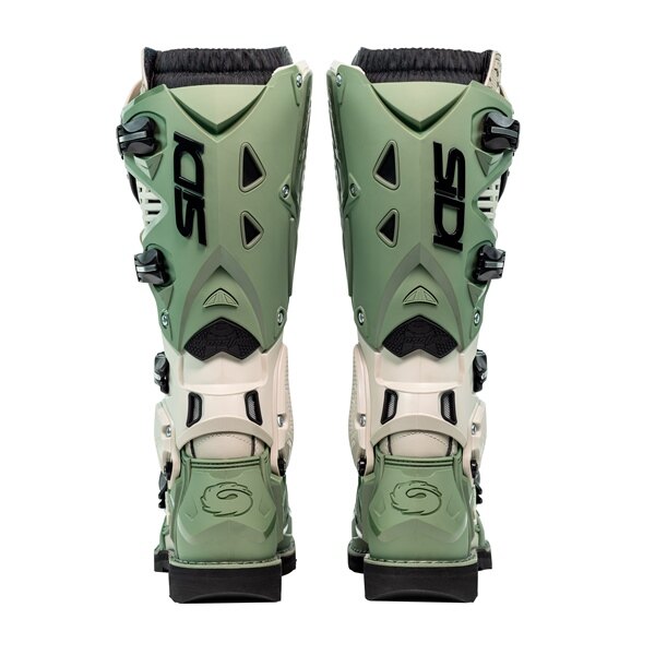 REPLACEABLE SHIN PLATE The thermoplastic shin front shin plate is anatomically shaped and replaceable, an exclusive-patented Sidi feature. MICRO ADJUSTABLE & REPLACEABLE BUCKLE SYSTEM The Sidi micrometric buckle used on motocross boots, with indented memory regulation straps. The buckle, strap and retaining clips are easily replaceable. The buckle has just one fixing point (by a screw), which allows them to be easily closed making the boot adaptable to the rider’s position. REPLACEABLE METATARSUS INSERT A rigid replaceable nylon insert has been added to protect the inside of the boot in case the rider’s foot slides off the foot peg or if it slips off the kick-starter. The insert is replaceable by unscrewing the 4 screws. THERMOPLASTIC DEFENDER ON THE TOE AREA The toe is entirely covered by 5 plastic protection panels with an embossed geometric design for greater grip. ANATOMICALLY SHAPED HEEL The heel is anatomically shaped and manufactured in PU. Its particular form was designed and implemented to provide more safety to the foot in case of twisting. The new heel guarantees comfort and stability ADJUSTABLE CALF SYSTEM The boot leg has a replaceable inner calf plate, produced in PU and a printed rubber insert, to protect the leg from exhaust heat, wear and tear. The calf plate features an inner double adjustment, which allows to widen the circumference of the boot and accommodate even wider calves and shin guards. achieve an improved fit. HYPER EXTENSION BLOCK The Crossfire 3 has an articulated joint on the ankle, called “HYPER EXTENSION BLOCK”, with completely revolutionized technology. It prevents the hyper extension of the ankle, the instep and the posterior tendon when the leg is flexed forwards or backwards. This technology guarantees the rider’s safety interlocking system. FLEX SYSTEM The upper pivot, on the bootleg, improves the flexibility of the boot and the adjustment of the bootleg itself. In this way, the rider can adjust the boot strap at the calf to his personal preference and achieve an improved fit. ASSEMBLED AND REPLACEABLE BOOT LEG - STITCH-FREE The boot leg (upper) is entirely assembled with screws, thus it is stitch-free and totally replaceable.